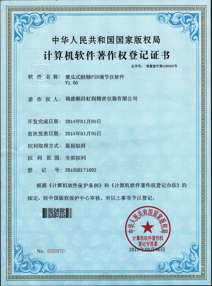 虹潤公司人工智能算式與模糊PID算式是虹潤公司應用自主知識產(chǎn)權開發(fā)的新一代智能溫控儀表,產(chǎn)品榮獲一種人工智能調(diào)節(jié)器及其調(diào)節(jié)方法(專利號:2016107742425)、模糊PID控制儀及控制方法(專利號2015109378814)、一種智能化控制器及自整定方法(專利號2016103155465)、閥門自動、手動無擾動操作控制方法及裝置(專利號2007101540083)4項國家發(fā)明專利,NHR人工智能模糊PID調(diào)節(jié)器(版權登記號2009SR044371)傻瓜式模糊PID調(diào)節(jié)儀軟件V1.00 (版權登記號2015SR171602)2項軟件著作權。