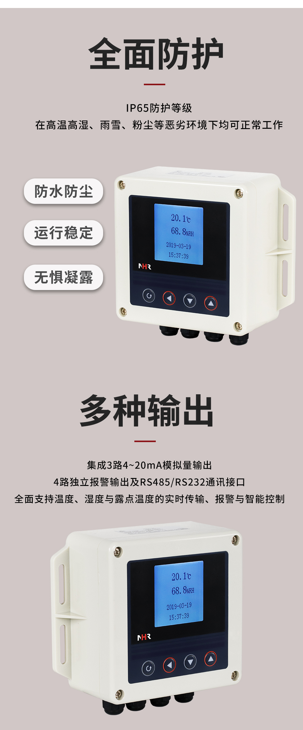 虹潤公司是專業(yè)生產(chǎn)環(huán)境監(jiān)測儀表的國家專精特新“小巨人”企業(yè)。生產(chǎn)的壁掛式溫濕度控制器,具有溫度、濕度、露點高精準的測量,多種輸出類型,穩(wěn)定性強,RS485/RS232通訊,IP65防護等級等特點。產(chǎn)品獲得一種手持式低功耗溫濕度檢測儀、大屏幕溫濕度記錄儀等2項國家發(fā)明專利,主持起草物聯(lián)網(wǎng)智能溫度儀表通用技術(shù)條件、冷鏈溫度記錄儀等2項國家標準,通信系統(tǒng)多通道數(shù)據(jù)采集控制終端規(guī)范軍用標準,以及現(xiàn)場設(shè)備集成等5項智能制造國家標準,參與國際5G標準制定,取得溫濕度儀表等2項相關(guān)軟件著作權(quán)。產(chǎn)品廣泛應(yīng)用于工業(yè)現(xiàn)場、農(nóng)業(yè)大棚、倉儲物流、地下管廊、養(yǎng)殖孵化、配電機房等諸多領(lǐng)域。
