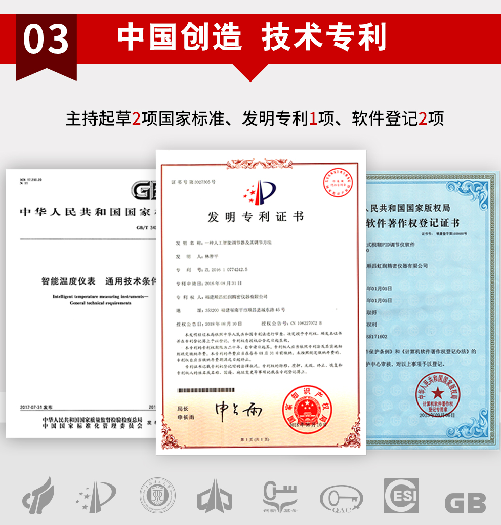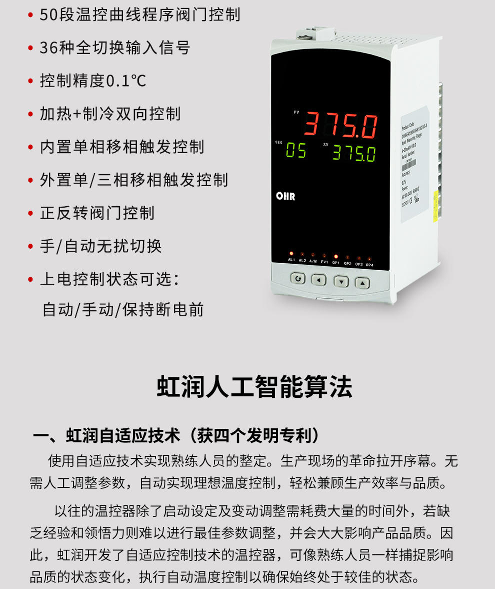 虹潤公司是專業(yè)生產溫控器的國家專精特新“小巨人”企業(yè)。生產的程序閥門溫控器,具有50段溫控程序控制,真正人工智能算式,無需人工整定參數,控制精度可達±0.1°C,加熱制冷雙向控制等特點。產品獲得模糊PID控制儀及控制方法、人工智能調節(jié)器、智能化控制器、移相觸發(fā)控制器、閥門自動手動無擾動操作控制方法及裝置等5項國家發(fā)明專利,主持起草智能溫度儀表通用技術條件、工業(yè)過程控制系統(tǒng)用模擬輸入兩位或多位輸出儀表、工業(yè)過程測量和控制系統(tǒng)用智能調節(jié)器等3項國家標準,,以及通信系統(tǒng)多通道數據采集控制終端規(guī)范軍用標準,參與國際5G標準制定,取得增強型分段調節(jié)器等3項相關軟件著作權。產品廣泛應用于電力、石化,冶金、制藥、食品等幾乎所有工業(yè)現(xiàn)場,實現(xiàn)精準控溫,保障生產安全與質量。