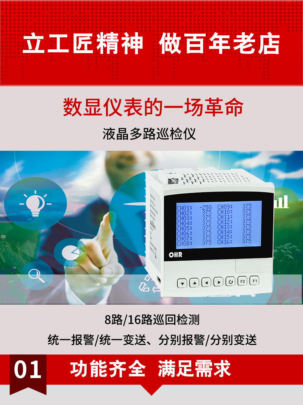 虹潤公司是專業(yè)生產(chǎn)多路溫度巡檢儀的國家專精特新“小巨人”企業(yè),生產(chǎn)的液晶多路巡檢儀,具有8路/16路測量通道,全切換信號輸入,統(tǒng)一報警統(tǒng)一變送輸出,分別報警分別變送輸出,RS485/RS232通訊等特點。產(chǎn)品獲得巡回檢測顯示方法及裝置、儀表殼體等2項國家發(fā)明專利,主持起草工業(yè)過程控制系統(tǒng)用模擬輸入兩位或多位輸出儀表、物聯(lián)網(wǎng)智能溫度儀表通用技術(shù)條件等2項國家標準,以及通信系統(tǒng)多通道數(shù)據(jù)采集控制終端規(guī)范軍用標準,參與國際5G標準制定,取得液晶多回路測量顯示控制儀等4項相關(guān)軟件著作權(quán)。產(chǎn)品廣泛應用于電力、石化、冶金、制藥、水處理、機械配套等各種工業(yè)現(xiàn)場。