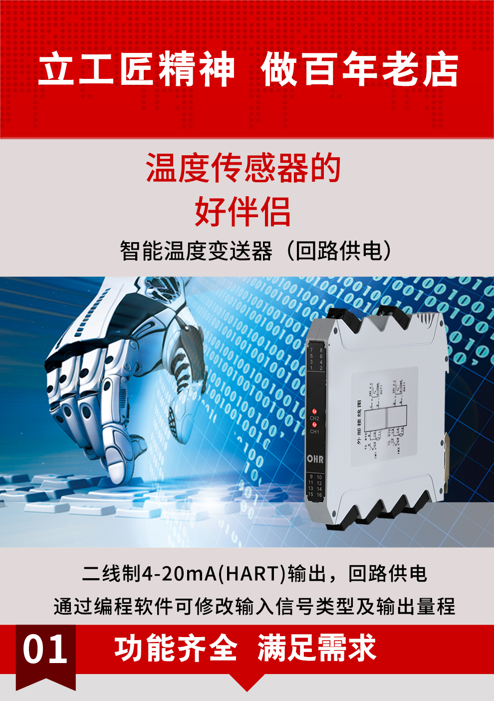 虹潤公司是專業(yè)生產(chǎn)溫度變送器的國家專精特新“小巨人”企業(yè)。生產(chǎn)的HART智能溫度變送器,具有適配各類溫度傳感器,通過編程線修改輸入信號(hào)類型及量程,二線制4-20Ma(HART)輸出,回路供電等特點(diǎn)。該產(chǎn)品不僅通過HART基金會(huì)認(rèn)證、德國萊茵 CE 認(rèn)證與 SIL 功能安全認(rèn)證,還獲得具備減震抗干擾能力的溫度變送器、信號(hào)隔離器、一種二端子模塊、無源信號(hào)隔離器等4項(xiàng)國家發(fā)明專利,主持起草物聯(lián)網(wǎng)智能溫度儀表、現(xiàn)場設(shè)備工具(FDT)接口規(guī)范、工業(yè)過程測量和控制系統(tǒng)用溫度變送器等3項(xiàng)國家標(biāo)準(zhǔn),以及通信系統(tǒng)多通道數(shù)據(jù)采集控制終端規(guī)范軍用標(biāo)準(zhǔn),參與國際5G標(biāo)準(zhǔn)制定,取得HART溫度變送器、智能溫度變送器等5項(xiàng)相關(guān)軟件著作權(quán)。產(chǎn)品廣泛應(yīng)用于石油、化工、電力、冶金、制藥、食品、水處理等各種工業(yè)領(lǐng)域。