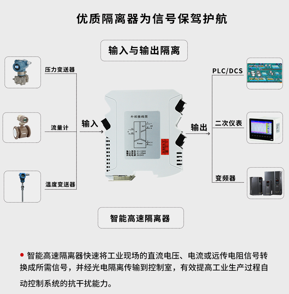 虹潤(rùn)公司是專業(yè)生產(chǎn)隔離器的國(guó)家專精特新“小巨人”企業(yè)。生產(chǎn)的智能高速隔離器 ,具有電壓電流遠(yuǎn)傳電阻輸入,10ms快速響應(yīng),輸入輸出電源三隔離,高抗干擾,低功耗發(fā)熱低等特點(diǎn)。產(chǎn)品獲得信號(hào)隔離器、一種二端子模塊、無(wú)源信號(hào)隔離器等3項(xiàng)國(guó)家發(fā)明專利,主持起草現(xiàn)場(chǎng)設(shè)備工具(FDT)接口規(guī)范、工業(yè)過(guò)程測(cè)量和控制系統(tǒng)用隔離式安全柵、工業(yè)過(guò)程測(cè)量和控制系統(tǒng)用配電器等3項(xiàng)國(guó)家標(biāo)準(zhǔn),以及通信系統(tǒng)多通道數(shù)據(jù)采集控制終端規(guī)范軍用標(biāo)準(zhǔn)。取得智能高速隔離器等3項(xiàng)相關(guān)軟件著作權(quán)。參與國(guó)際5G標(biāo)準(zhǔn)制定。產(chǎn)品廣泛應(yīng)用于電力、石化,冶金、制藥、水處理、機(jī)械配套等各種工業(yè)現(xiàn)場(chǎng)。