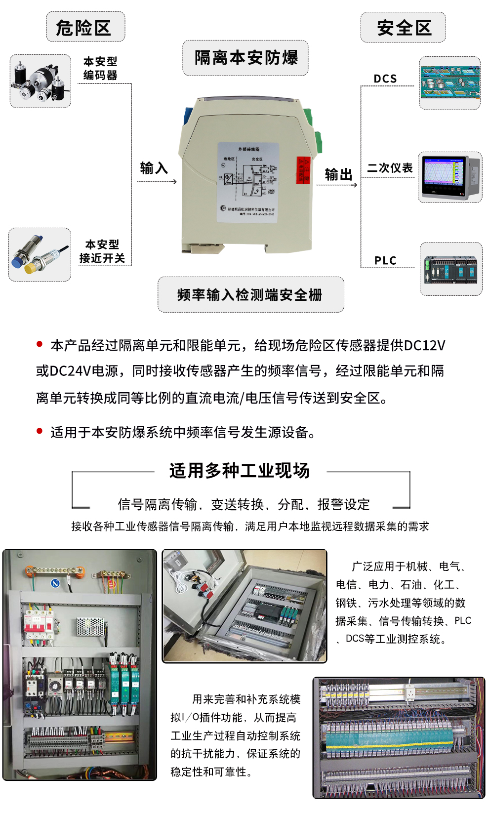 虹潤(rùn)公司是專業(yè)生產(chǎn)隔離器的國(guó)家專精特新“小巨人”企業(yè)。生產(chǎn)的隔離式安全柵涵蓋信號(hào)頻率輸入、電壓輸入、電流輸入、熱電阻輸入、熱電偶輸入、開(kāi)關(guān)量輸入等多種產(chǎn)品類(lèi)型。產(chǎn)品獲得具備減震抗干擾能力的溫度變送器、信號(hào)隔離器、一種二端子模塊、無(wú)源信號(hào)隔離器等4項(xiàng)國(guó)家發(fā)明專利,主持起草物聯(lián)網(wǎng)智能溫度儀表、現(xiàn)場(chǎng)設(shè)備工具(FDT)接口規(guī)范、工業(yè)過(guò)程測(cè)量和控制系統(tǒng)用溫度變送器等3項(xiàng)國(guó)家標(biāo)準(zhǔn),以及通信系統(tǒng)多通道數(shù)據(jù)采集控制終端規(guī)范軍用標(biāo)準(zhǔn)。參與國(guó)際5G標(biāo)準(zhǔn)制定,取得智能隔離式安全柵等4項(xiàng)相關(guān)軟件著作權(quán)。產(chǎn)品廣泛應(yīng)用于石油、電力、化工,冶金、智能制造、污水處理等諸多行業(yè)。