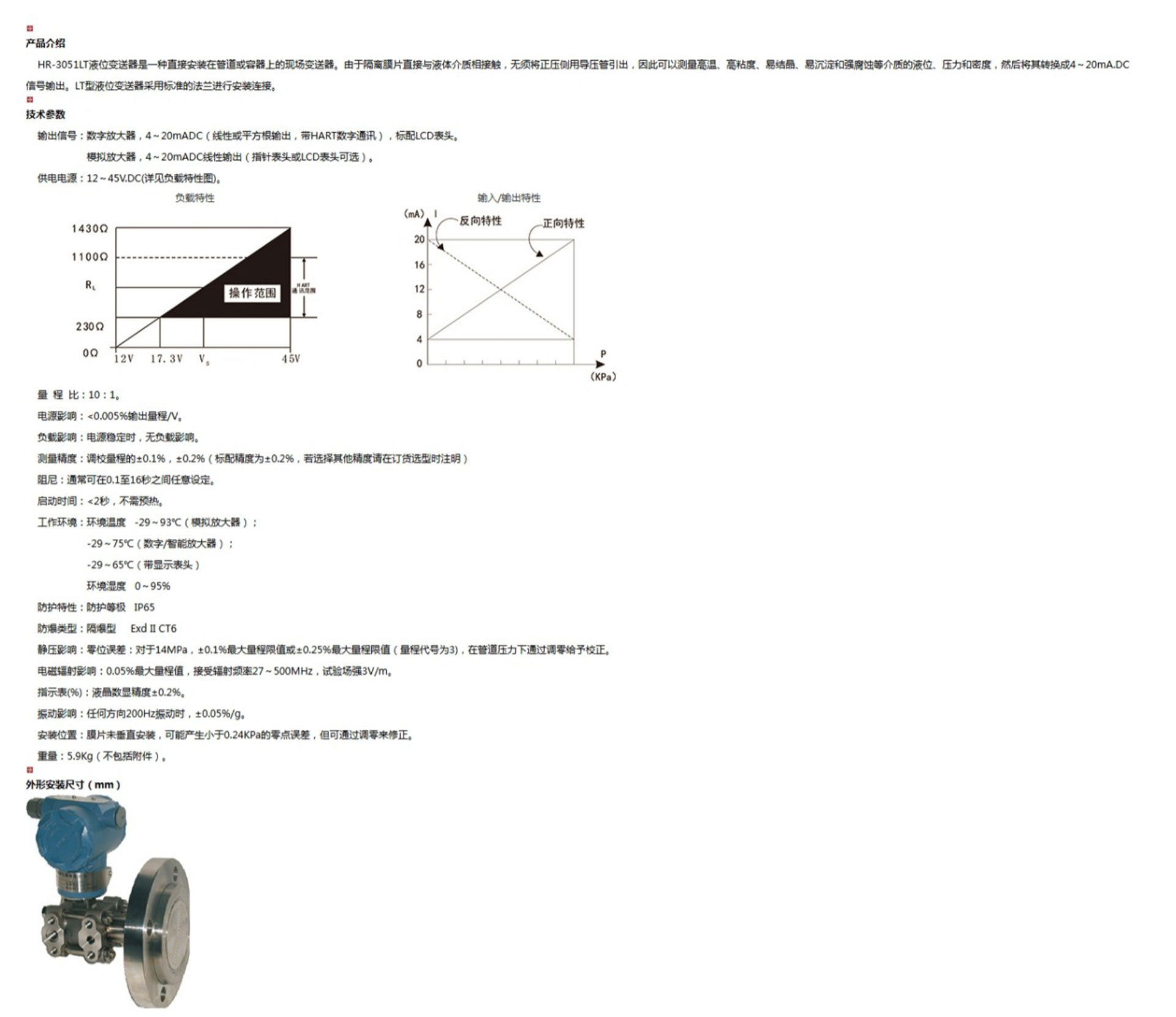 HR-3051LT液位變送器是一種直接安裝在管道或容器上的現(xiàn)場(chǎng)變送器。由于隔離膜片直接與液體介質(zhì)相接觸,無(wú)須將正壓側(cè)用導(dǎo)壓管引出,因此可以測(cè)量高溫、高粘度、易結(jié)晶、易沉淀和強(qiáng)腐蝕等介質(zhì)的液位、壓力和密度,然后將其轉(zhuǎn)換成4~20mA.DC信號(hào)輸出。
