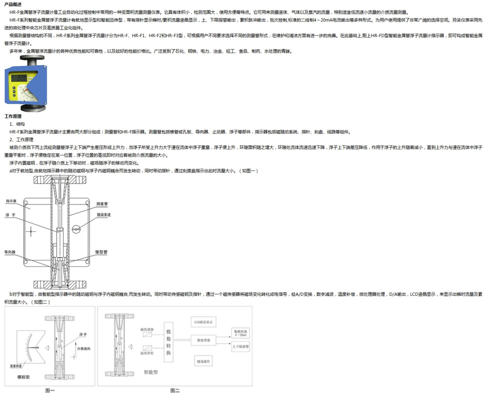 HR-F金屬管浮子流量計是工業(yè)自動化過程控制中常用的一種變面積流量測量儀表。它具有體積小,檢測范圍大,使用方便等特點。它可用來測量液體、氣體以及蒸汽的流量,特別適宜低流速小流量的介質(zhì)流量測量。